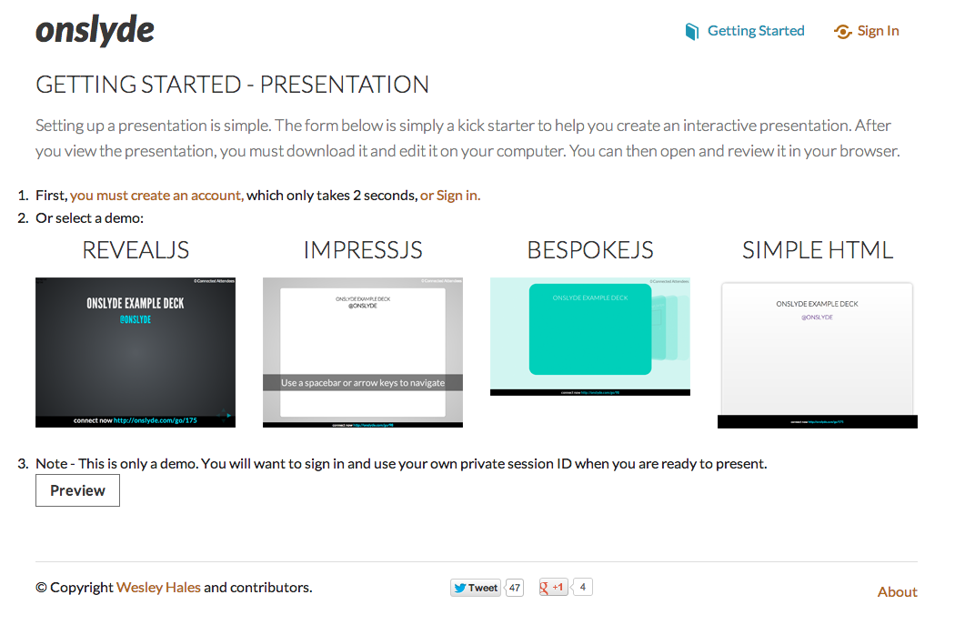 After you’ve signed in, the “Getting Started” page will give you options for setting up a poll. After hitting the “Preview” button, you must save the HTML to your computer in order to edit and present the slides.